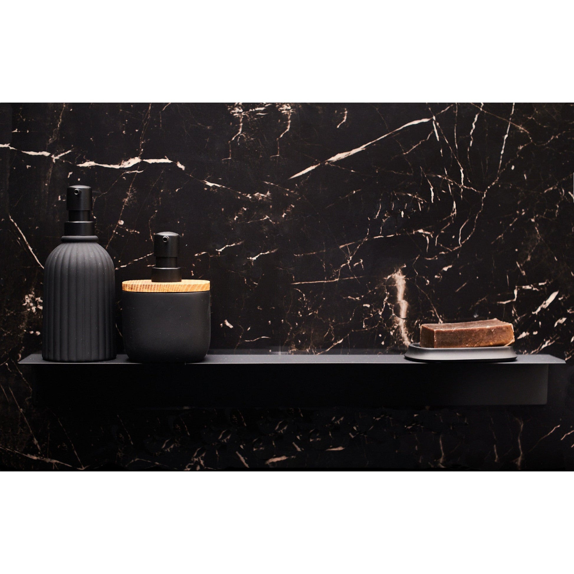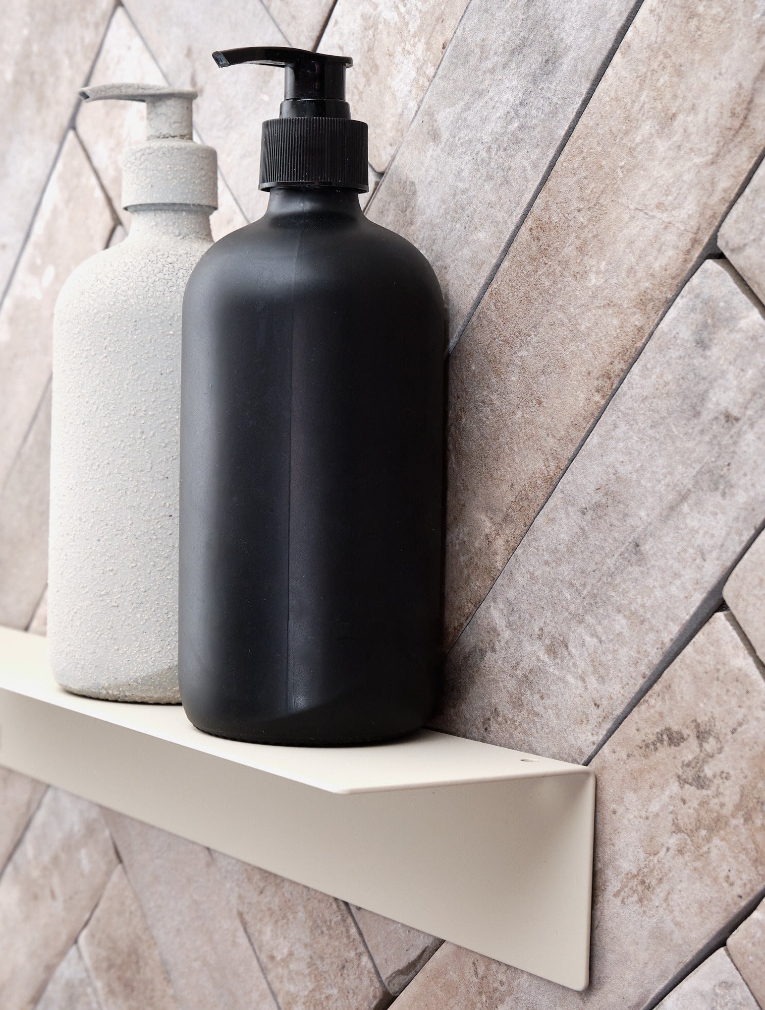 NAKA® hylly, maalattua alumiinia. Sopii hyvin esimerkiksi shampoohyllyksi kylpyhuoneeseen. Helppo itsekiinnittyvä ruuviton teippikiinnitys.