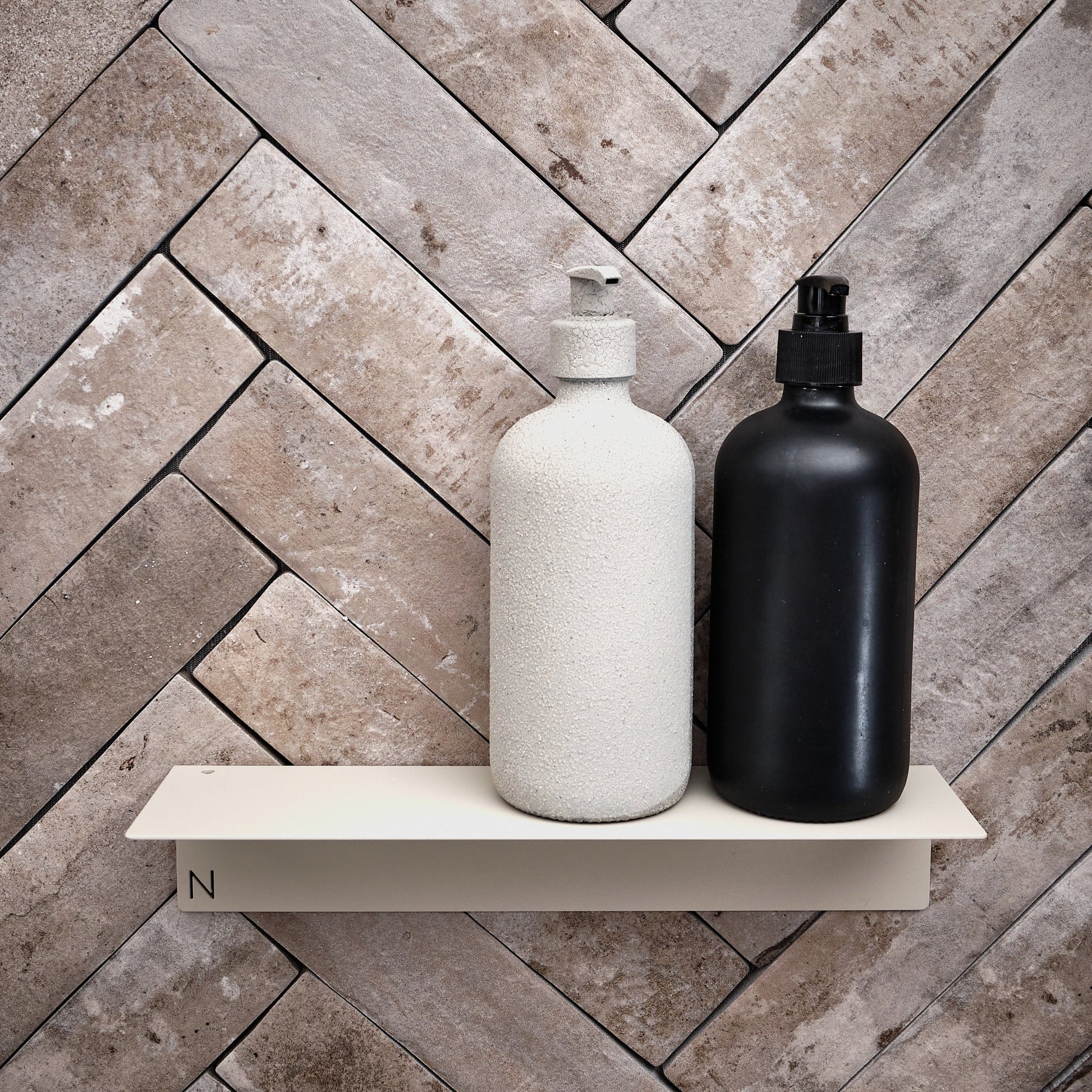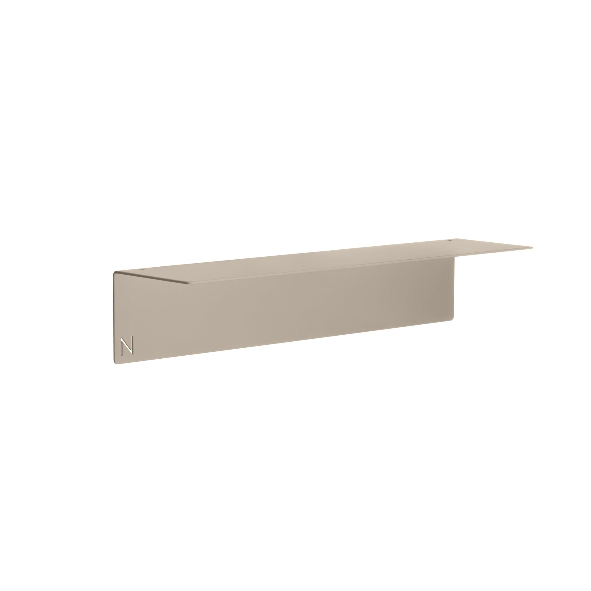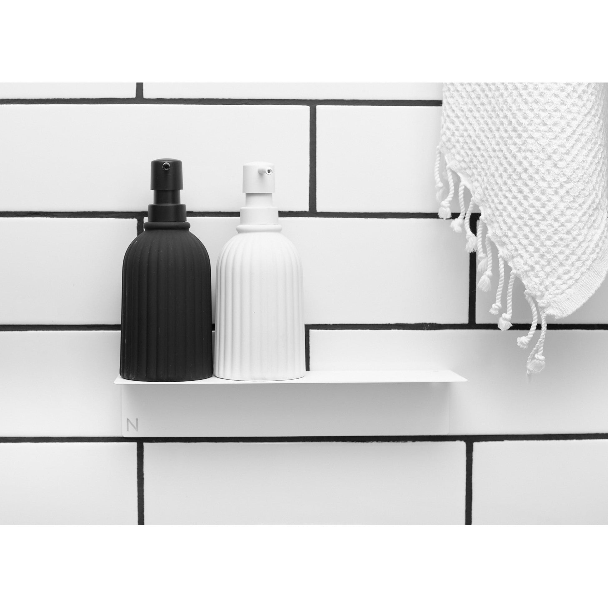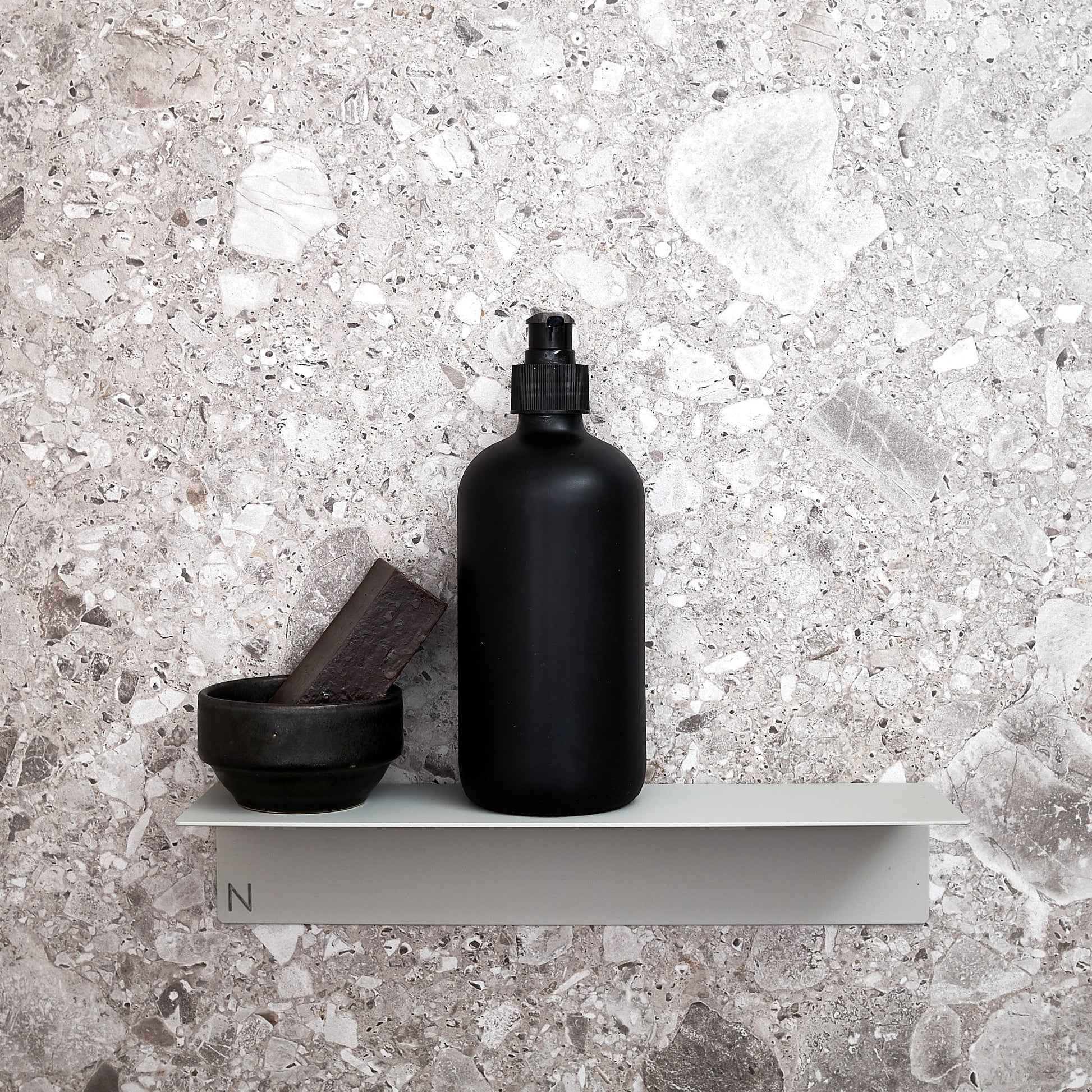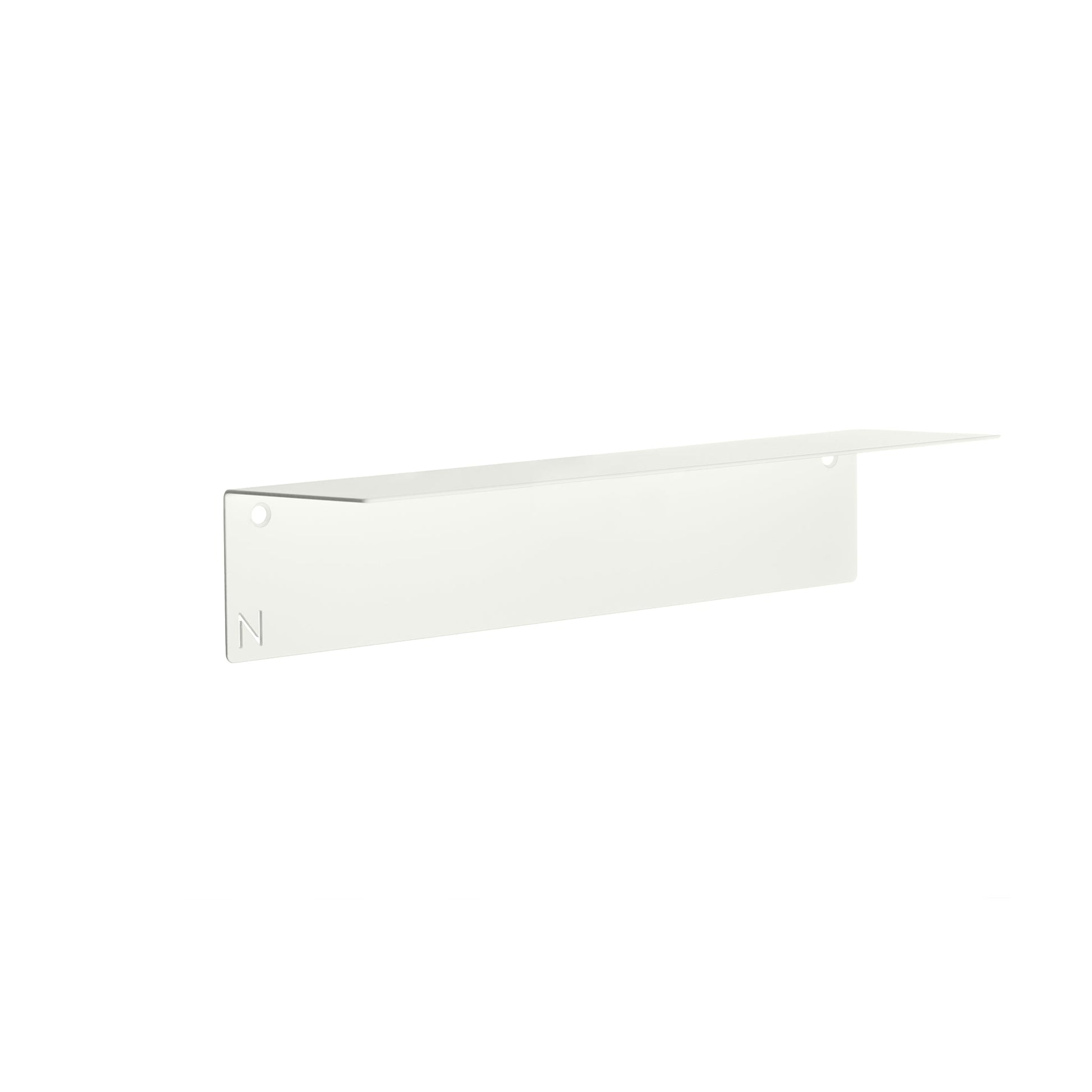 NAKA® hylly, maalattua alumiinia. Sopii hyvin esimerkiksi shampoohyllyksi kylpyhuoneeseen. Helppo itsekiinnittyvä ruuviton teippikiinnitys.