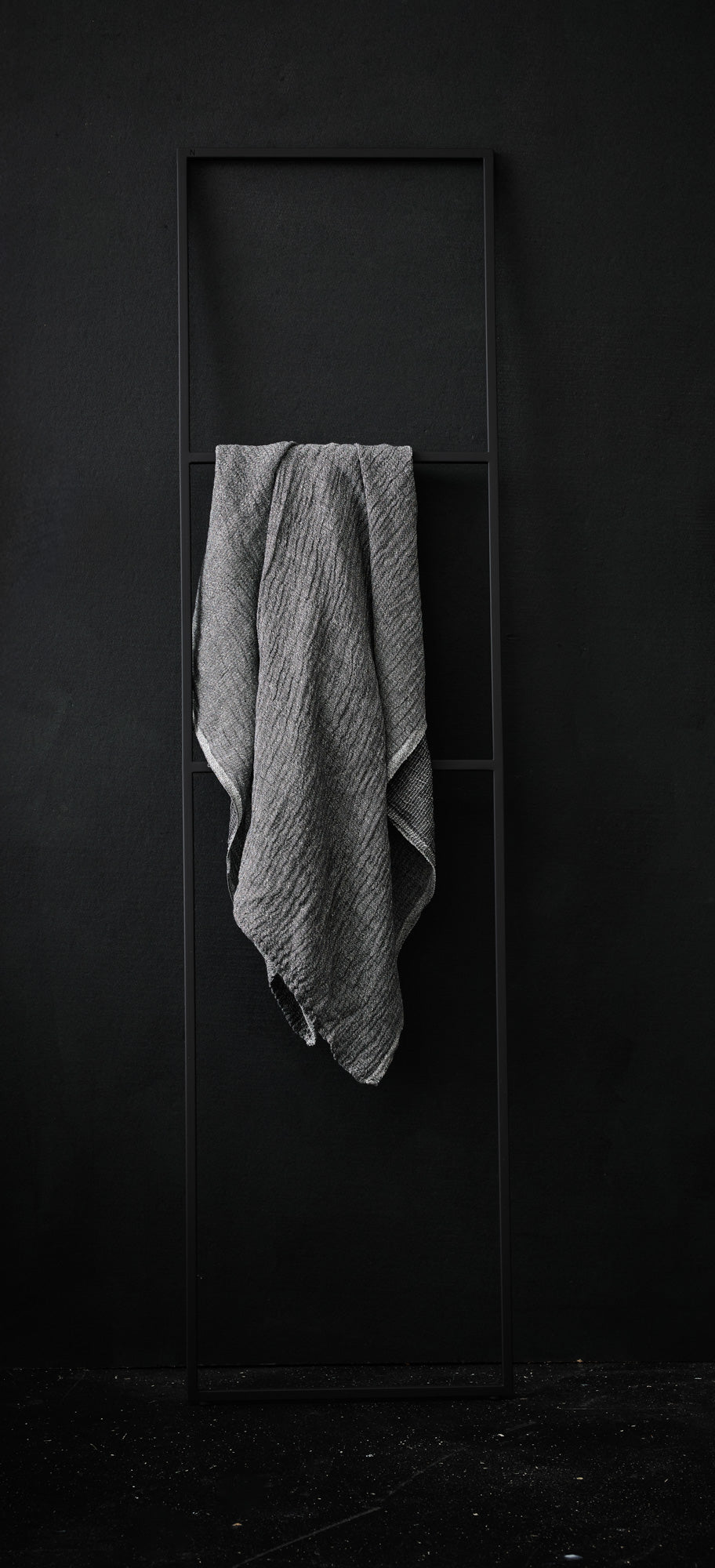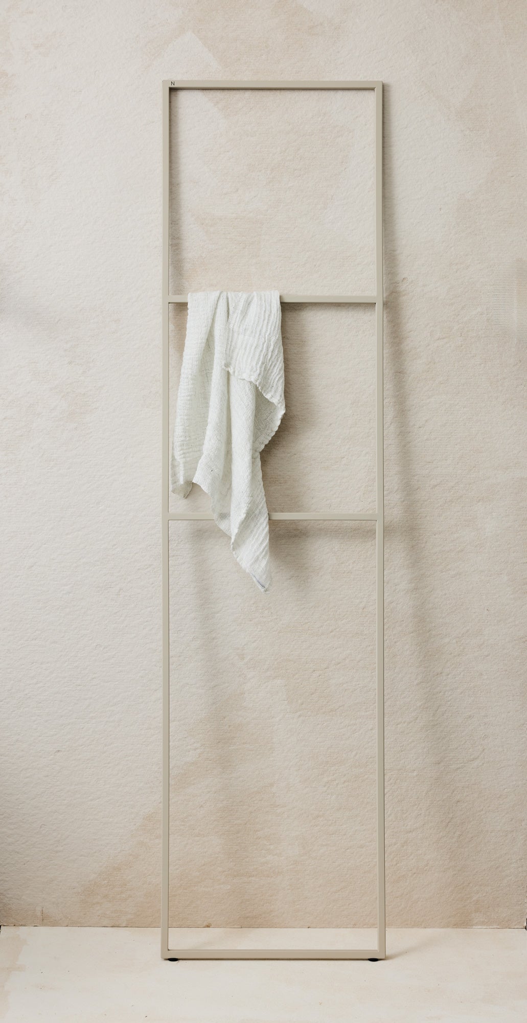 Stilrent og frittstående håndklestativ som egner seg for både innendørs og utendørs bruk. Krever ingen montering – stativet lener seg mot veggen og står stabilt med sklisikker bunn.