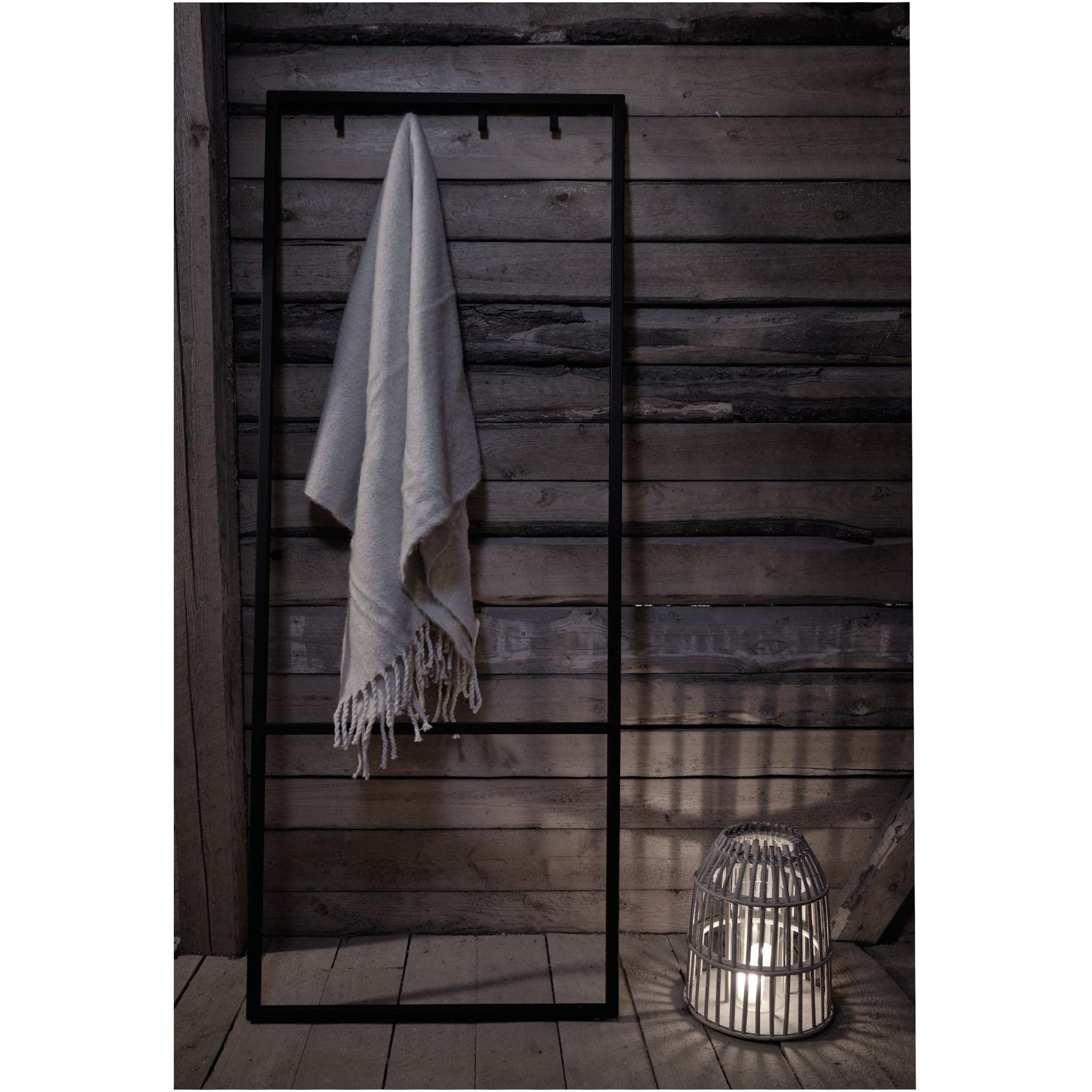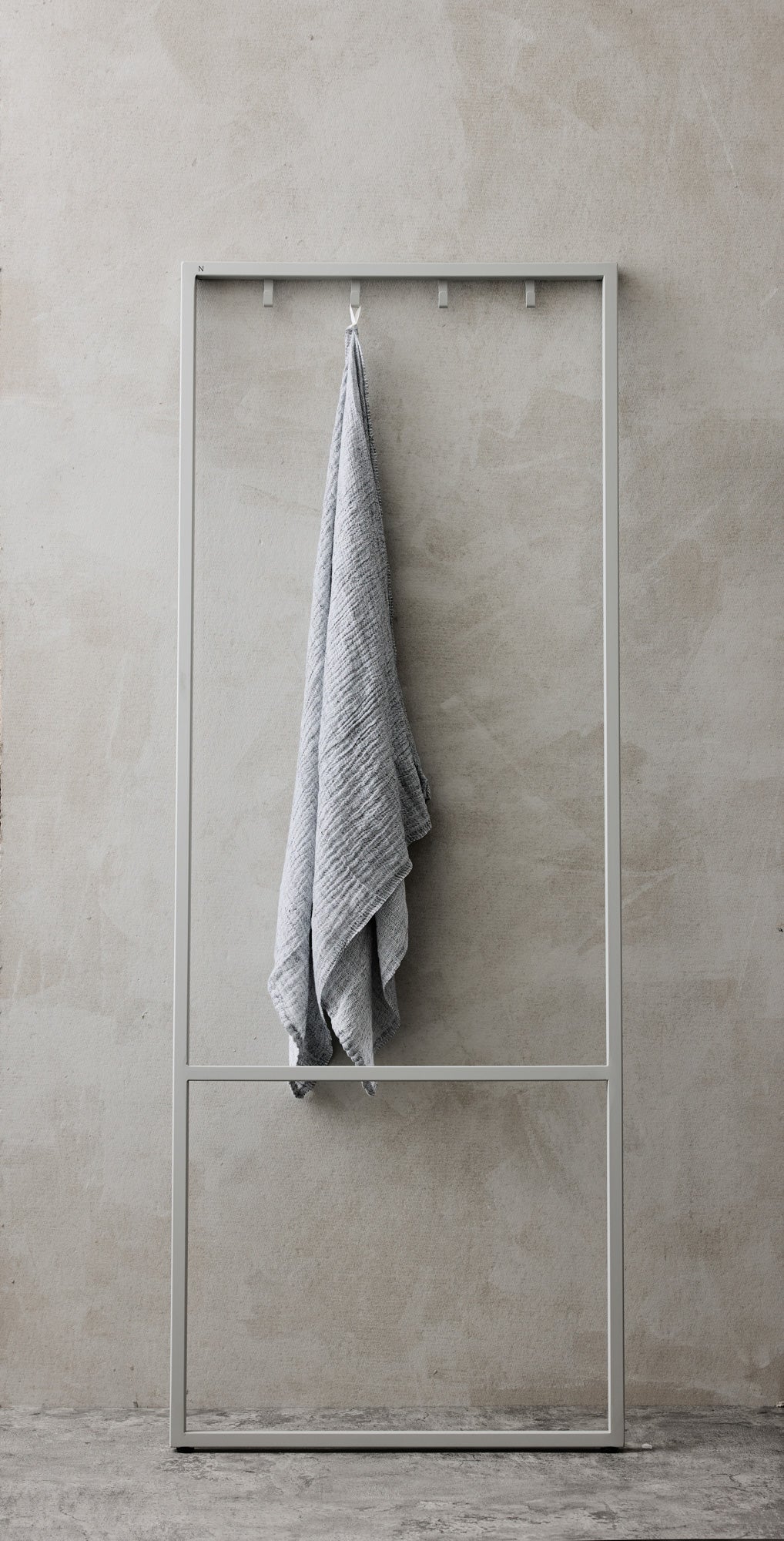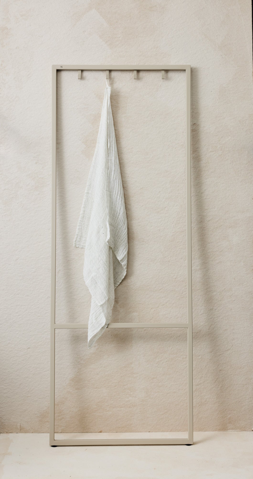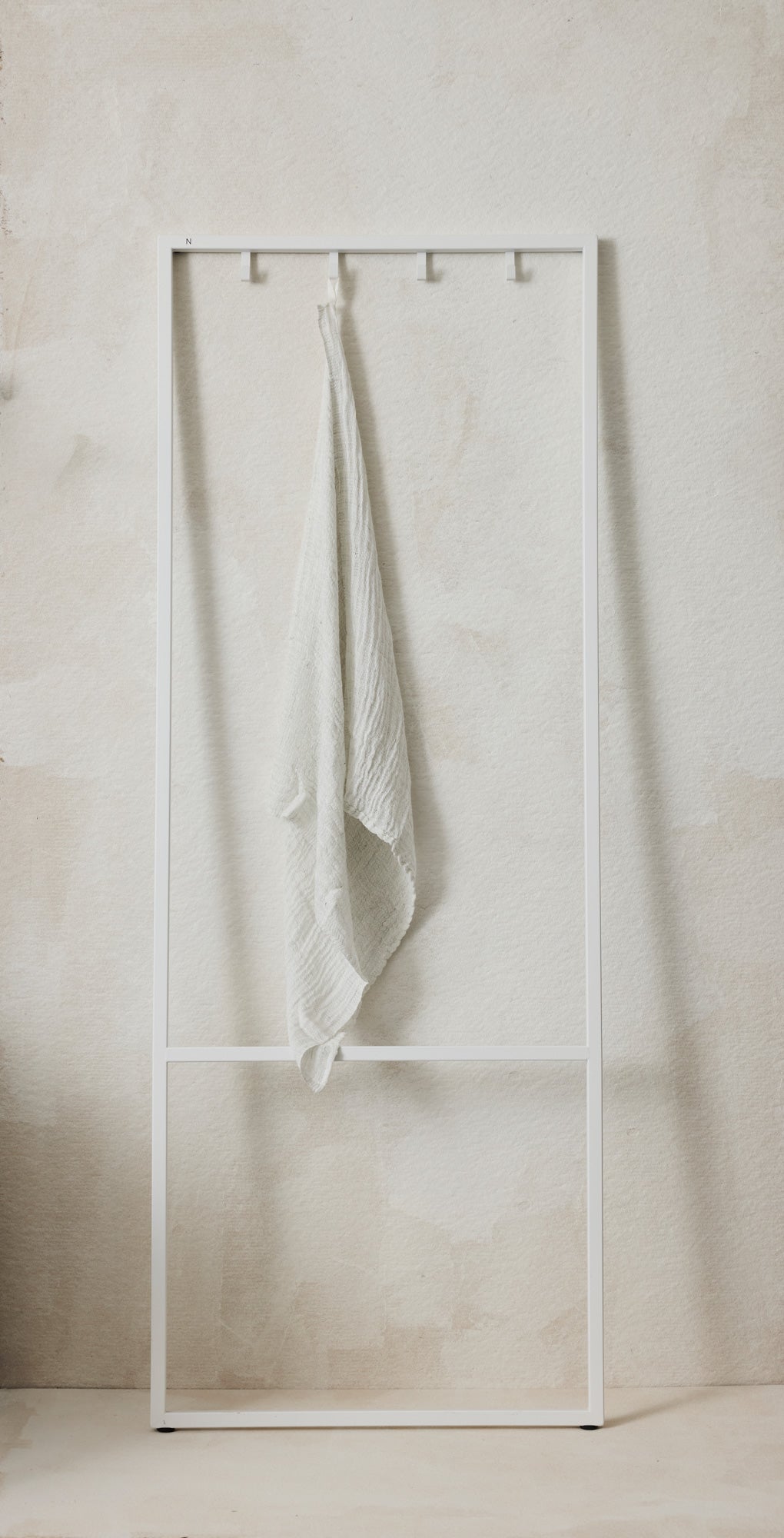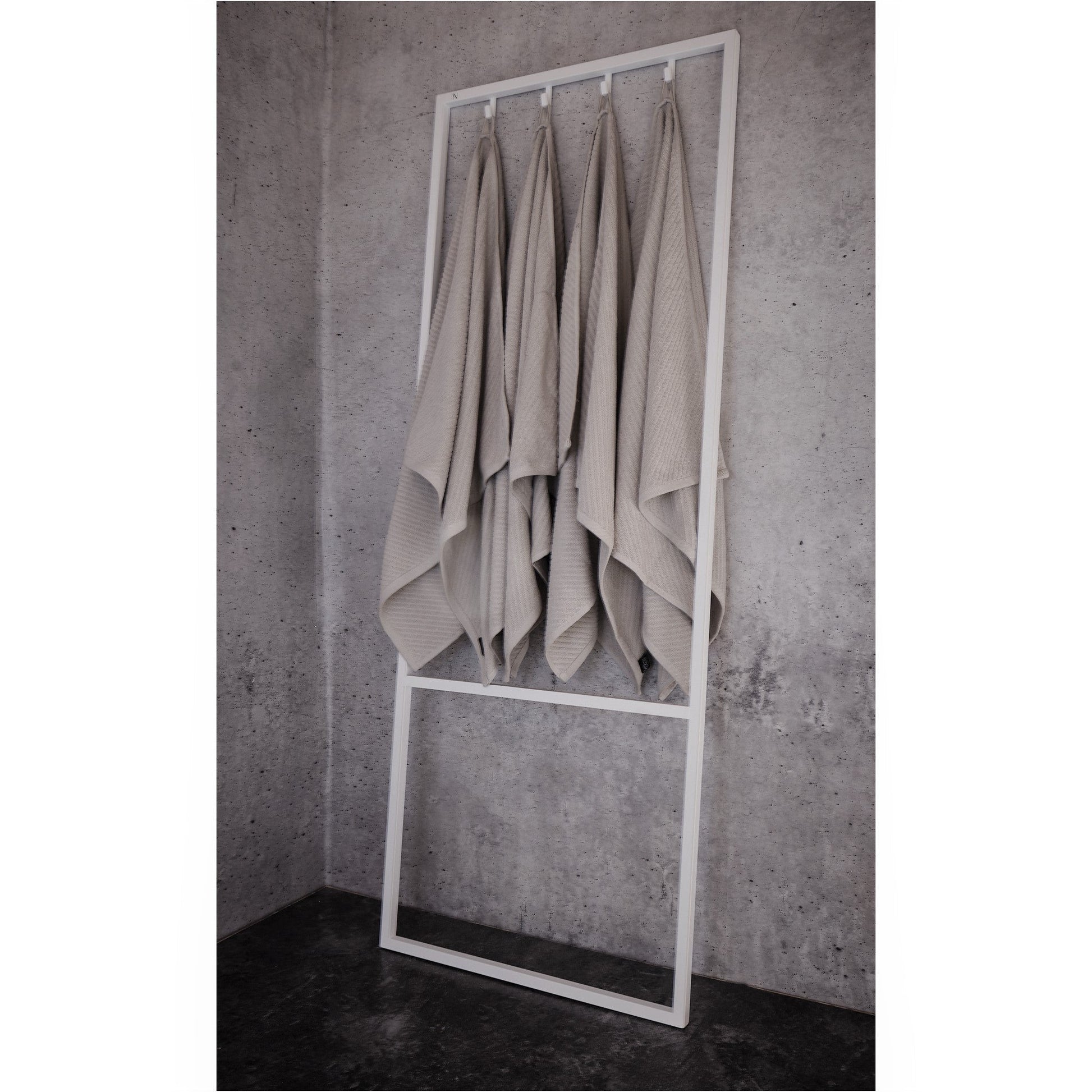 Minimalistisk og funksjonelt håndklestativ med fire kroker. Egnet for både innendørs og utendørs bruk. Krever ingen montering – stativet lener seg lett mot veggen og har sklisikker bunn som holder det på plass.